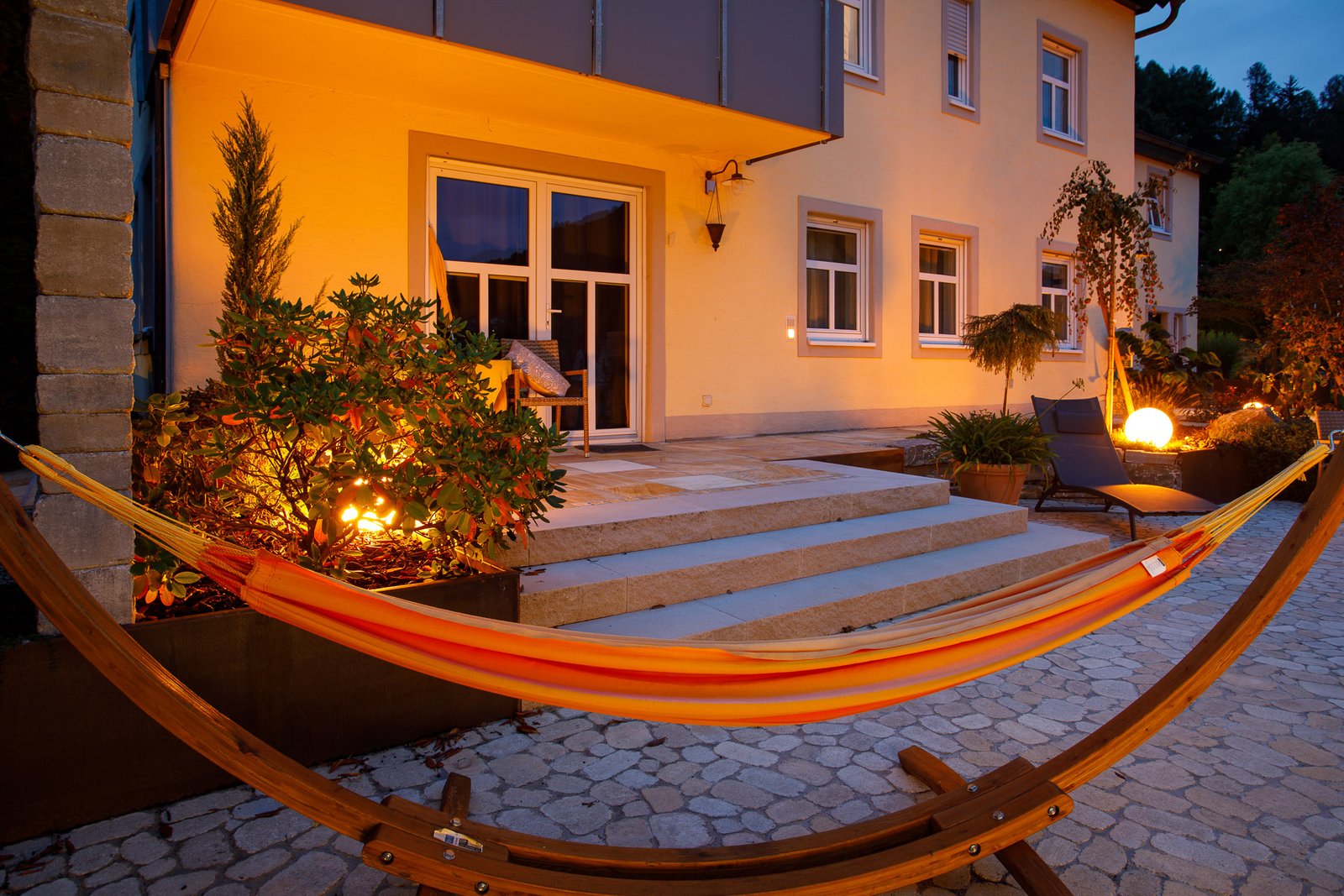 Gemütlichkeit am Abend. Integrierte Spots in Holzdecks oder LED-Stripes unter Blockstufen sorgen für indirektes, warmes Licht – perfekt für das Glas Wein am Abend.