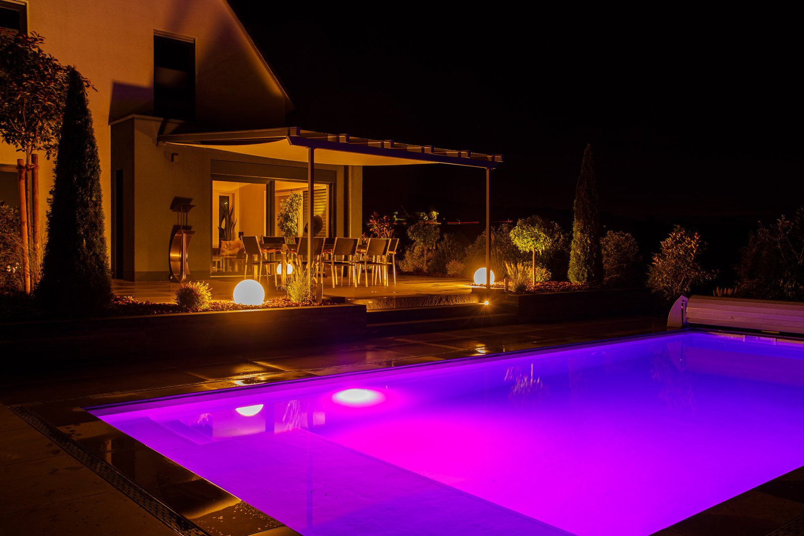 Beleuchteter Pool mit farbiger LED-Unterwasserbeleuchtung, Terrassenbau und Außenbeleuchtung im modernen Garten in Hirschaid von BELLA FLORA GmbH.