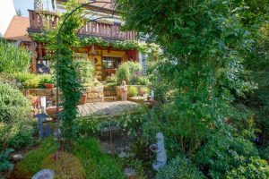 BELLA FLORA GmbH konnte die „verwunschene“ Eingewachsenheit erhalten. Der Garten wirkt absichtlich nicht geradlinig, sondern verwinkelt und überraschend abwechslungsreich. So fängt die Seele schon von der ersten Sekunde an zu baumeln.