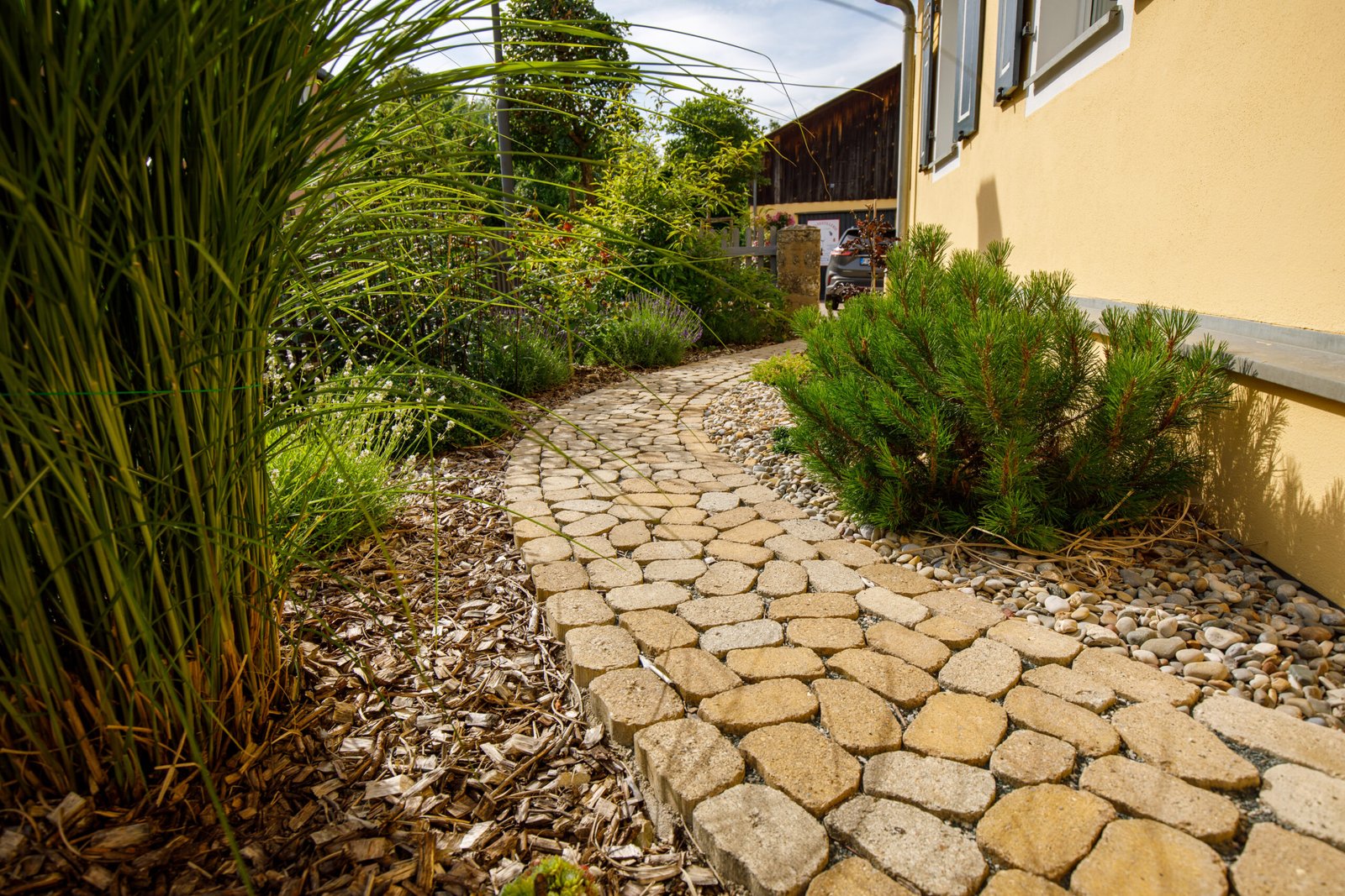 Trockenen Fußes durch den Garten. Ob geschwungene Pfade aus Kleinpflaster oder moderne Trittplatten im Rasen: Wir verbinden Ihre Gartenbereiche harmonisch.
