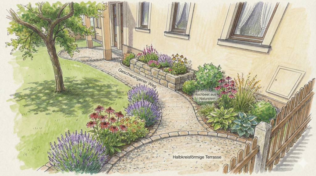 Der Weg zur Haustür wurde nicht stur geradeaus, sondern in einem sanften Schwung angelegt. Das wirkt einladend und bricht die Strenge.