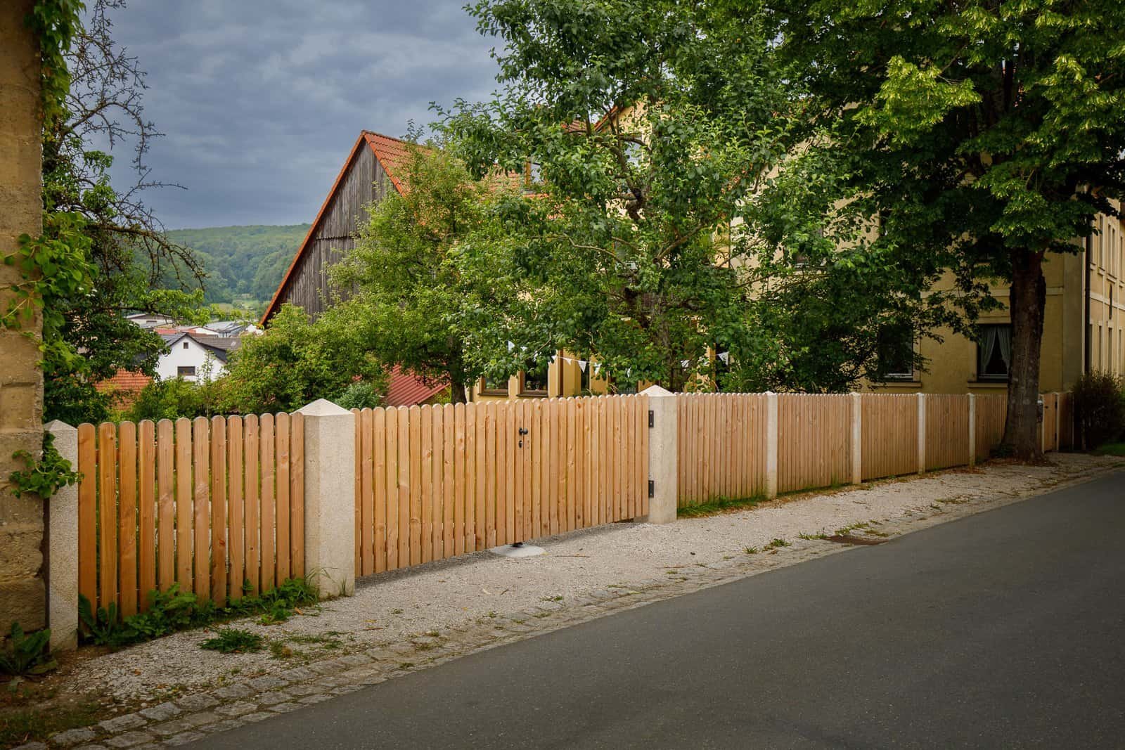 Als Einfriedung haben wir einen klassischen Staketenzaun mit abgerundeten Latten gewählt. Er grenzt das Grundstück sicher zur Straße ab, wirkt aber durch die offene Bauweise freundlich und transparent – passend zum Ortsbild von Pretzfeld.