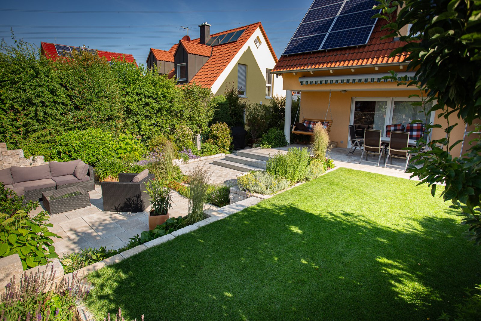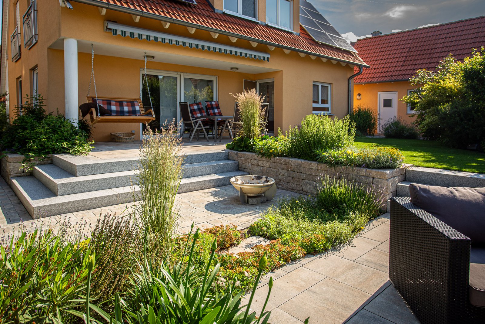 Entstanden ist ein exklusives „Wohnzimmer im Freien“. Wir haben hochwertige Granitblockstufen mit einem modernen Systemmauerwerk kombiniert. Das Besondere: Die Mauern fangen nicht nur die Erde ab, sondern dienen dank breiter Abdeckung gleichzeitig als Sitzbank für Gäste. Abgerundet durch Rollrasen und eine biodiverse Pflanzung ist dieser Garten nun ein Unikat in Bamberg.
