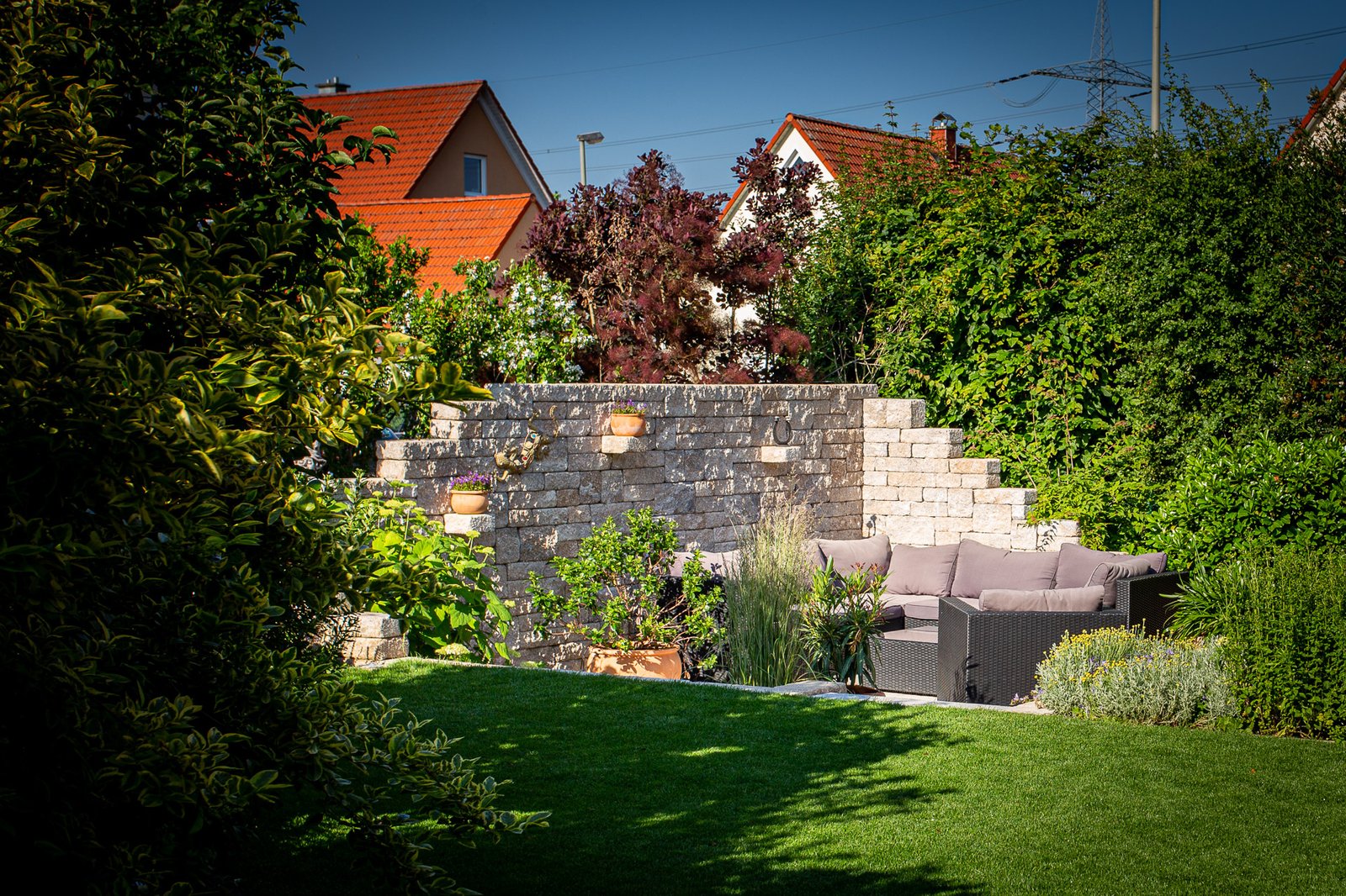 Gestufte Kulissenmauer aus Betonsteinblöcken mit Kiesfläche, Liegebereich und integrierten Pflanznischen als Ruheplatz im Garten, Stützmauer und Gartenbau in Hirschaid von BELLA FLORA GmbH.