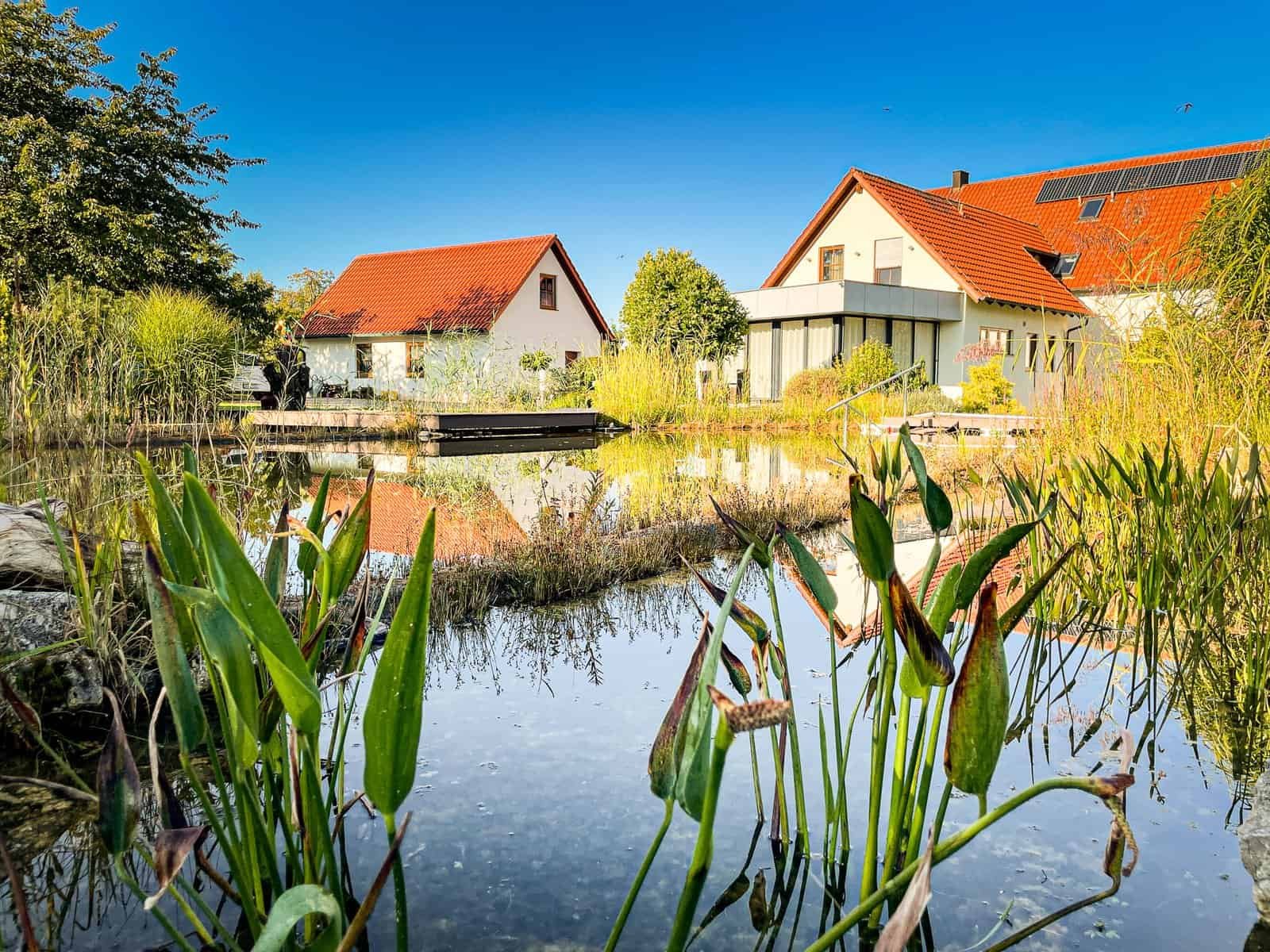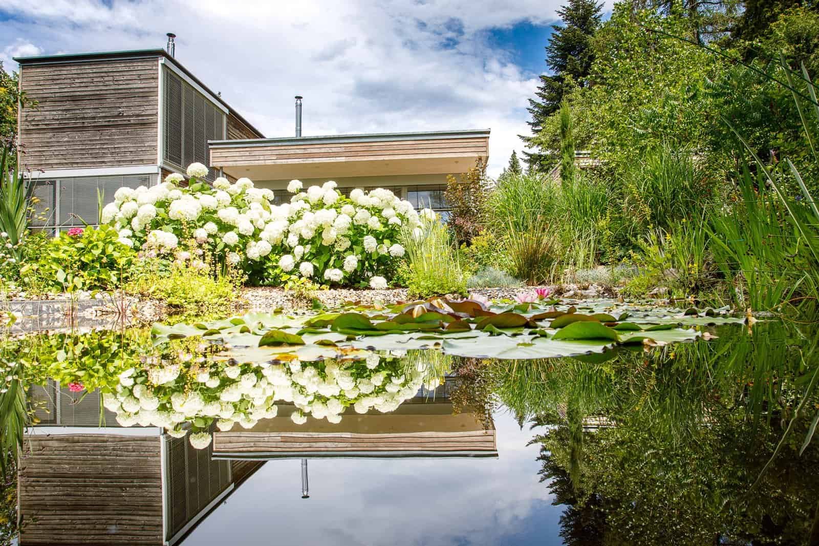 Baden in reinem Wasser. Ganz ohne Chemie. Ein Schwimmteich verbindet das Badevergnügen mit natürlicher Optik. Die Reinigung erfolgt biologisch durch Pflanzen und Kiesfilter.